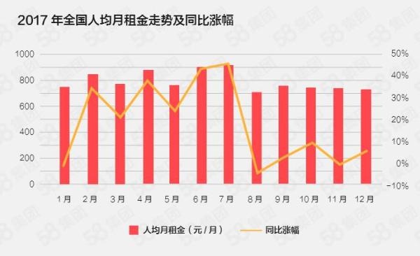 值得關注的(de)是,包括四(si)川省成都(dou)、浙(zhe)江(jiang)省杭州、湖北(bei)省武(wu)漢等12個熱點二線城(cheng)市(shi)的(de)租賃需求(qiu)占全國(guo)總(zong)量的(de)比例約20%,較2016年(nian)上漲(zhang)(zhang)43%,漲(zhang)(zhang)幅超一線城(cheng)市(shi)。租(zu)賃需求增(zeng)加的同時,租金呈現(xian)上漲趨勢。來(lai)自58同城的租房數據顯(xian)示(shi), 2017年全國(guo)年度人均月租金價格同比上漲16.7%。